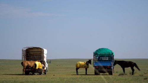 主席臺中央,用牛糞燃起香料,這是賽前的規(guī)矩,意為祈求人馬平安。騎手騎著戰(zhàn)馬圍繞香料堆數(shù)圈以后,才依次走出場地,消失在遠方的地平線上,頗有幾分古時征戰(zhàn)前夕的氣氛。他們將被領到幾十公里外的出發(fā)點,再放馬返回到起點,速度最快為勝。