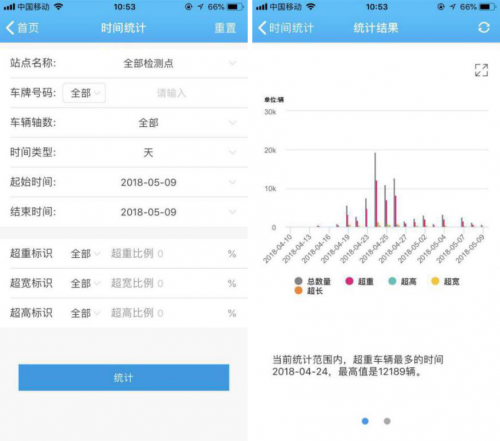 統(tǒng)計(jì)分為按時(shí)間統(tǒng)計(jì)、按站點(diǎn)統(tǒng)計(jì)、按軸數(shù)統(tǒng)計(jì)以及流量趨勢(shì)??蛇x擇所需要的統(tǒng)計(jì)方式進(jìn)行不同時(shí)間段車(chē)牌號(hào)碼或所在站點(diǎn)以及超重等統(tǒng)計(jì)。統(tǒng)計(jì)出來(lái)的結(jié)果會(huì)以適合的圖表類型顯示出來(lái),并且根據(jù)不同用戶擁有的權(quán)限還可以打印、導(dǎo)出數(shù)據(jù)。
