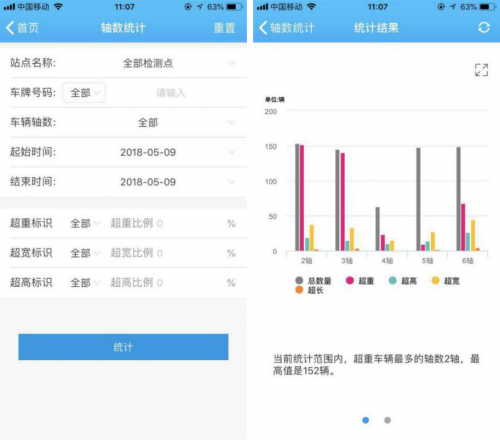 軸數(shù)統(tǒng)計(jì):用戶可按2-6軸的統(tǒng)計(jì)條件進(jìn)行統(tǒng)計(jì)并得到最想要的數(shù)據(jù),同時(shí)也可以點(diǎn)擊數(shù)據(jù)圖中的任意一個(gè)線點(diǎn)查看數(shù)據(jù)信息,并且可以點(diǎn)擊屏幕左右滑動(dòng)查看數(shù)據(jù)。