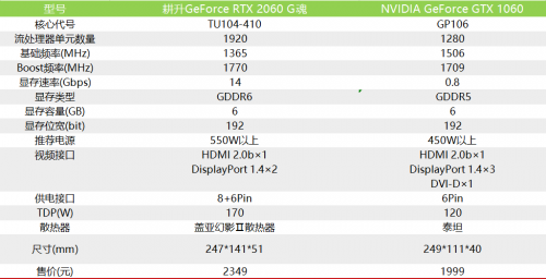 從參數(shù)來看,耕升GeForce RTX 2060 G魂與NVIDIA GeForce GTX 1060相比,CUDA核心數(shù)增加至1920,動(dòng)態(tài)核心頻率提升為1770MHz,顯存頻率從8000MHz提升到14000MHz,顯存類型升級(jí)為GDDR6。不過最主要的區(qū)別在于加入了支持光線追蹤技術(shù)與DLSS技術(shù)的Tensor Core以及RT Core,數(shù)量分別為240和30。如此一來即可游玩最新支持光線追蹤與DLSS技術(shù)的游戲,幀數(shù)與畫面效果將大幅提升。