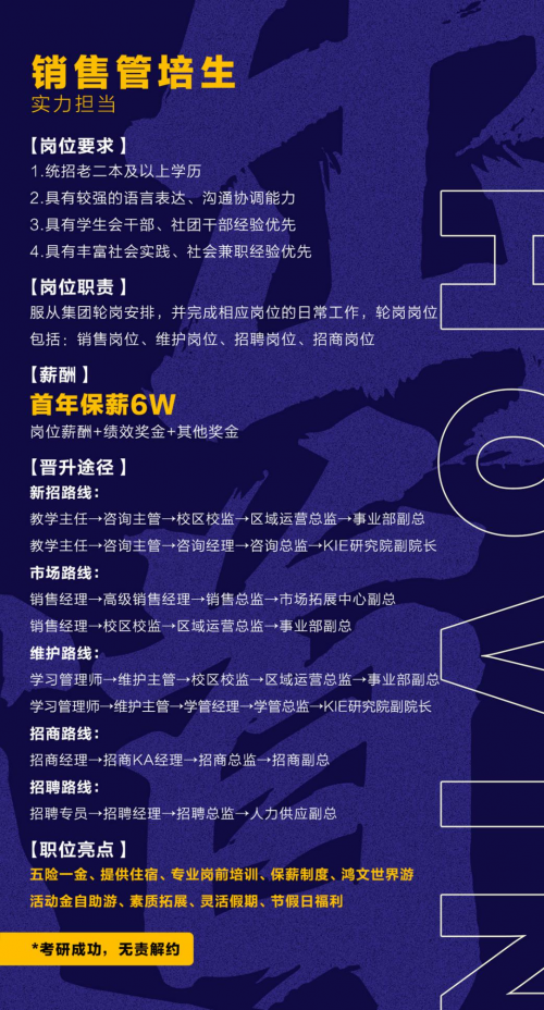 此次秋招選拔,我們將公開招募高中全學科講師(頭腦擔當)、銷售管培生(實力擔當)、職能管培生(戰(zhàn)略擔當)和雛鷹計劃成員(隊長擔當)。四個不同崗位,各自獨當一面,畢業(yè)生們可以在適合自己的崗位綻放光芒!